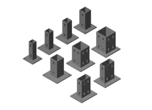 Pies, escuadras de fijación al suelo, soportes de anclaje, ruedas y soportes ajustables que garantizan la estabilidad y/o movilidad de las estructuras.
